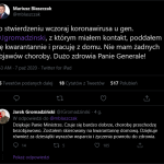Dzisiaj (7 października) na twitterze Ministra Obrony Narodowej Mariusza Błaszczaka pojawiła się informacja, że Minister poddał się kwarantannie w zw. ze stwierdzeniem koronawirusa u gen. Jarka Gromadzińskiego